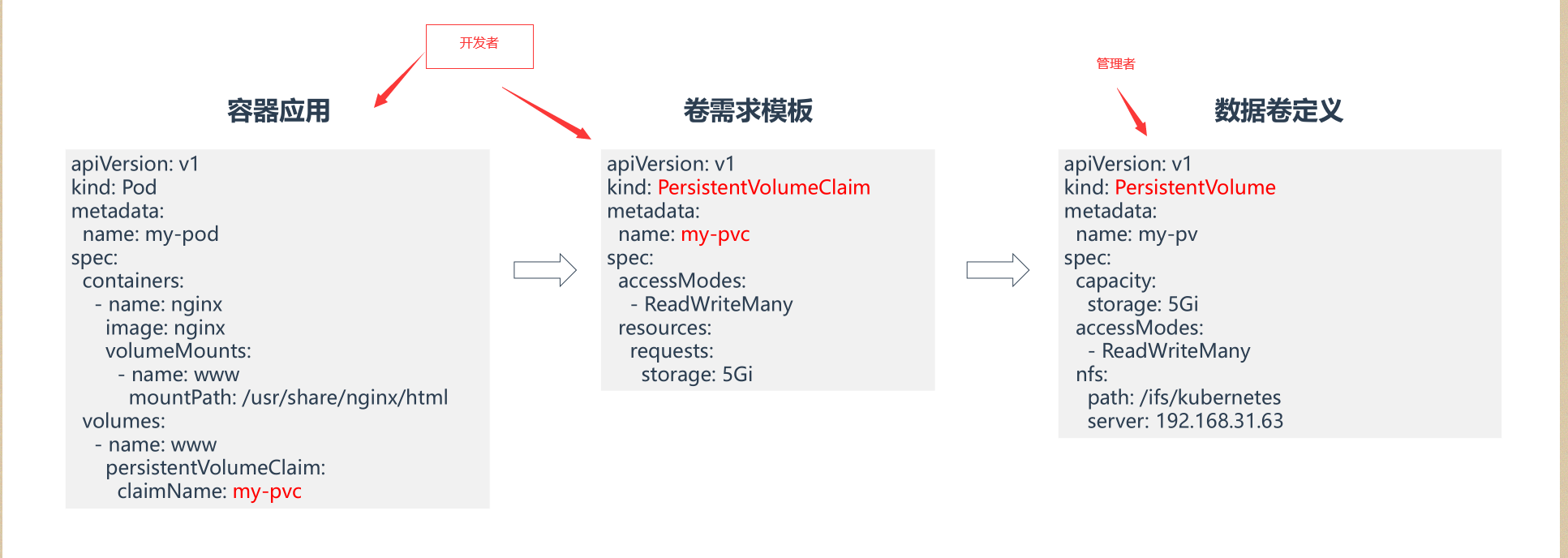 其中,容器应用内的引用与卷需求模板由开发提供,数据卷定义由k8s管理员安排