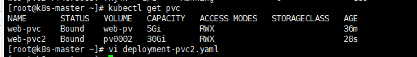 vi deployment-pvc.yamlapiVersion: apps/v1kind: Deploymentmetadata:name: web-pvcspec:selector:matchLabels:app: nginxreplicas: 3template:metadata:labels:app: nginxspec:containers:- name: nginximage: nginxvolumeMounts:- name: wwwrootmountPath: /usr/share/nginx/htmlvolumes:- name: wwwrootpersistentVolumeClaim:claimName: web-pvc---apiVersion: v1kind: PersistentVolumeClaimmetadata:name: web-pvcspec:accessModes:- ReadWriteManyresources:requests:storage: 5Gi