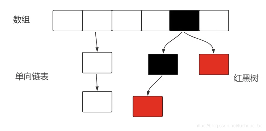JDK 1.8的HashMap 的数据结构如下图所示:当链表节点较少时仍然是以链表存在,当节点大于较多时(大于8)会转为红黑树。
