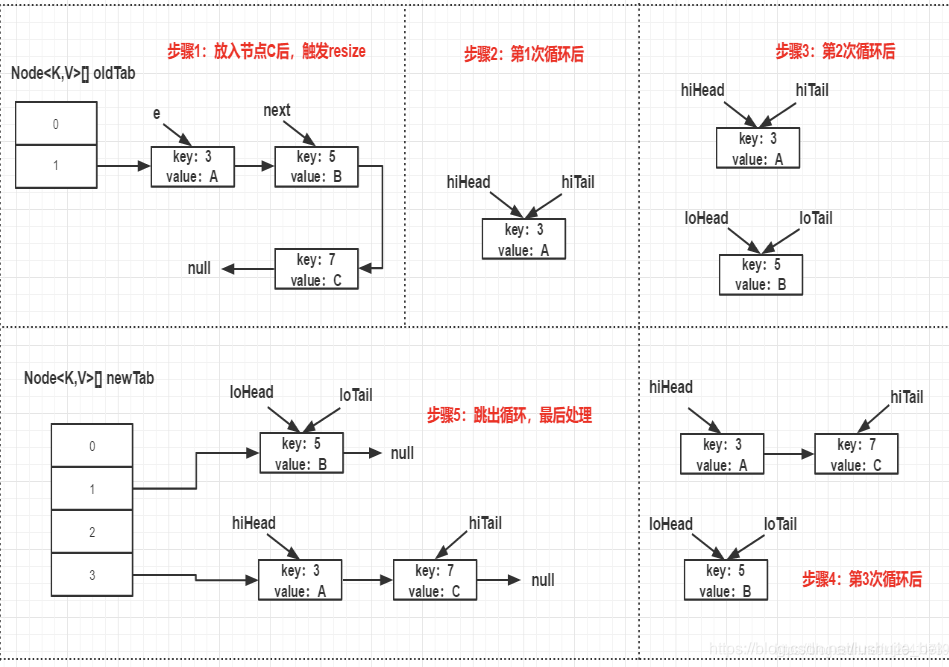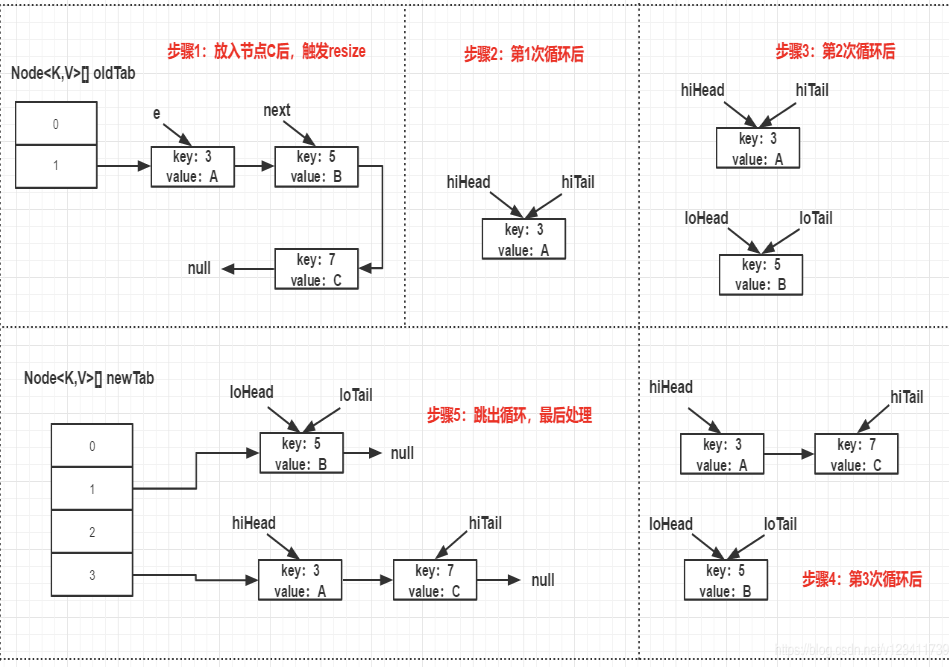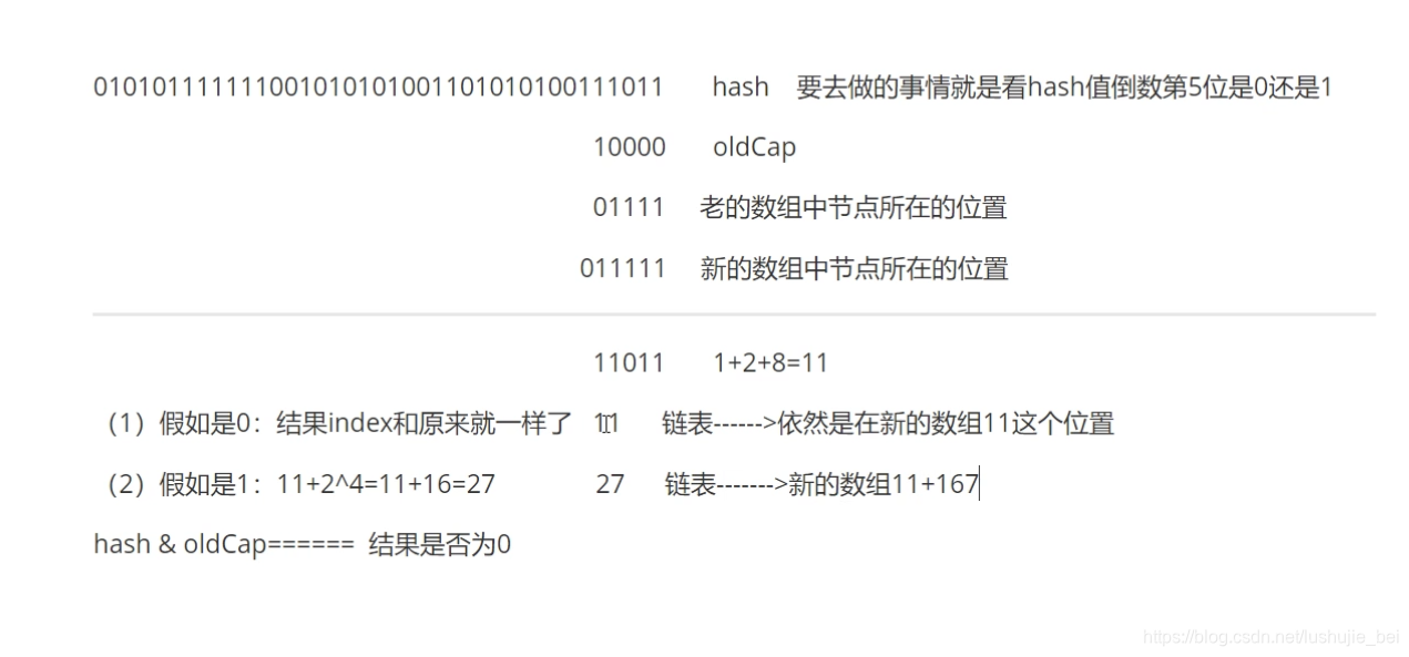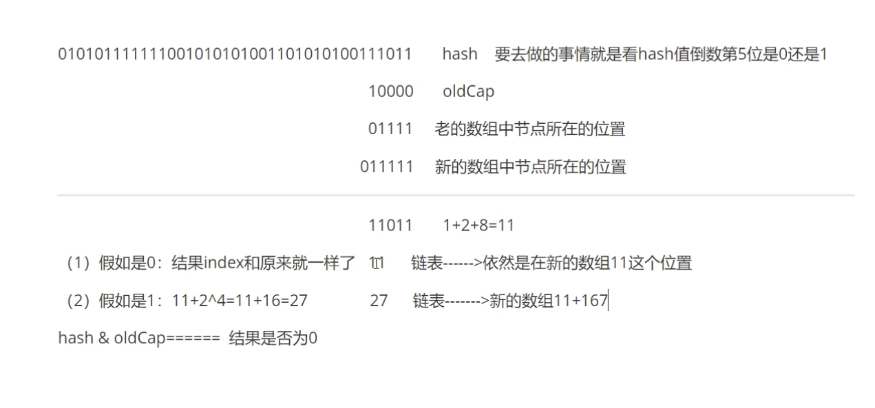 5:导致 HashMap 扩容后,同一个索引位置的节点重 hash 最多分布在两个位置的根本原因是:1)table的长度始终为 2 的 n 次方;2)索引位置的计算方法为 “(table.length - 1) & hash”。HashMap 扩容是一个比较耗时的操作,定义 HashMap 时尽量给个接近的初始容量值。