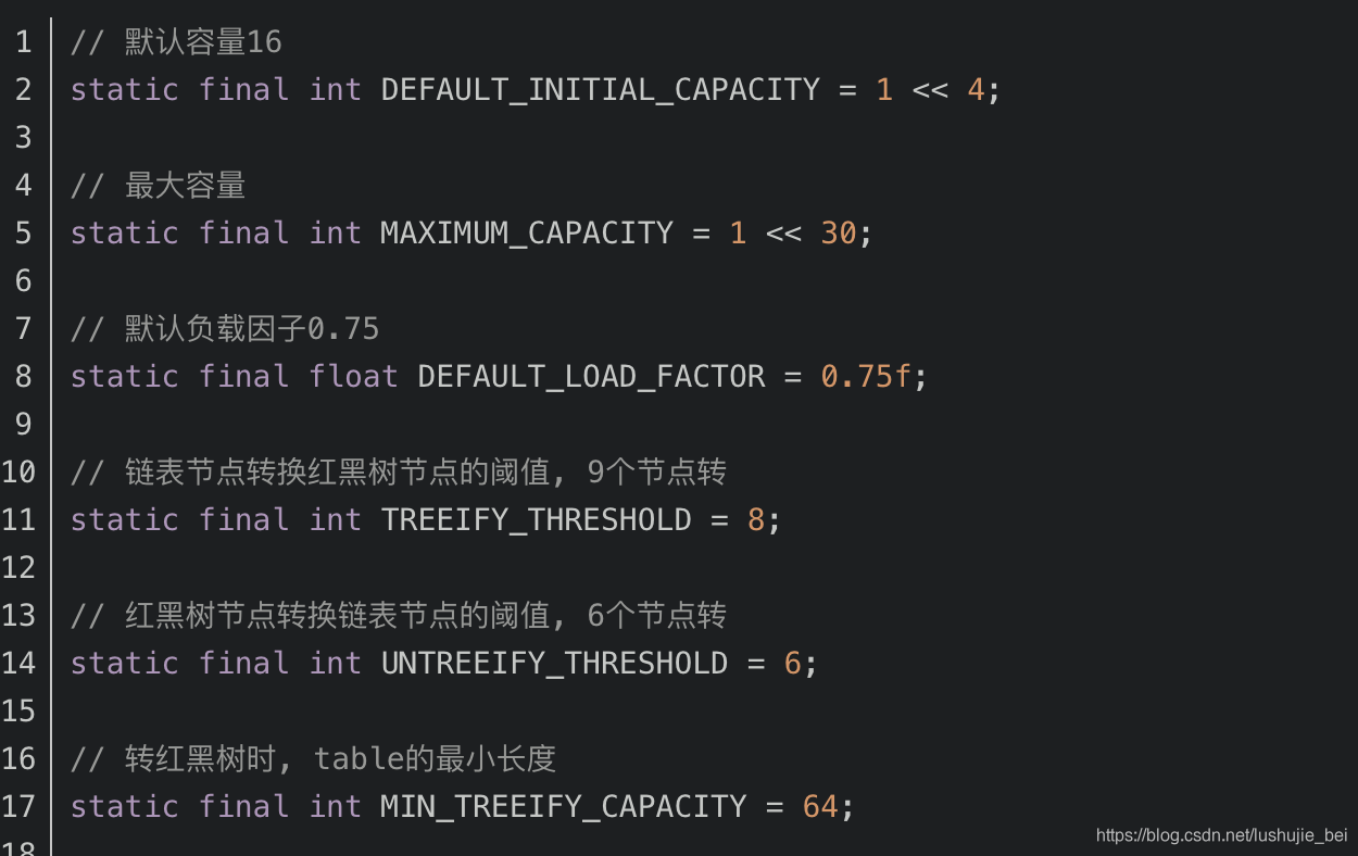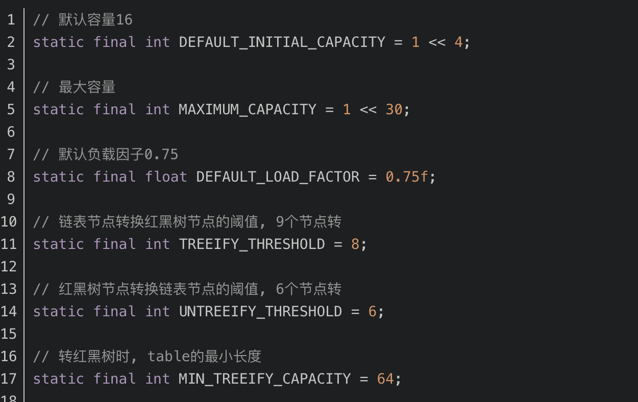 3:HashMap 的默认初始容量(capacity)是 16,capacity 必须为 2 的幂次方;默认负载因子(load factor)是 0.75;实际能存放的节点个数(threshold,即触发扩容的阈值)= capacity * load factor;
