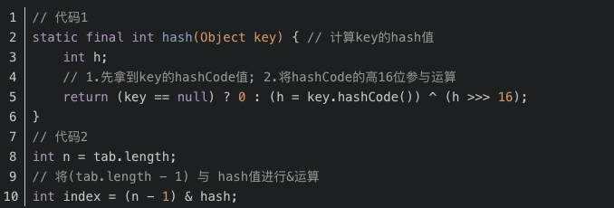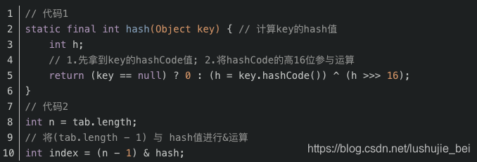 2:增加,删除,查找键值对时,定位到哈希桶数组的位置是很关键的一步,源码中是通过下面3个操作来完成这一步:1)拿到 key 的 hashCode 值;2)将 hashCode 的高位参与运算,重新计算 hash 值;3)将计算出来的 hash 值与 “table.length - 1” 进行 & 运算。