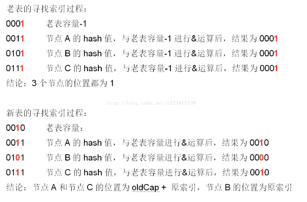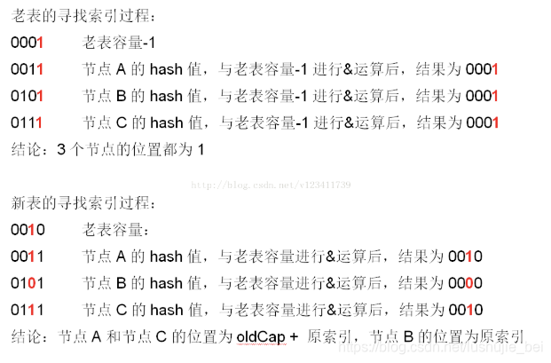 先看下老表和新表计算索引位置的过程:(hash 计算省略前面 28 位 0,只看最后 4 位