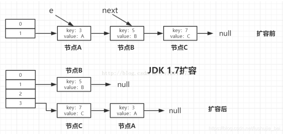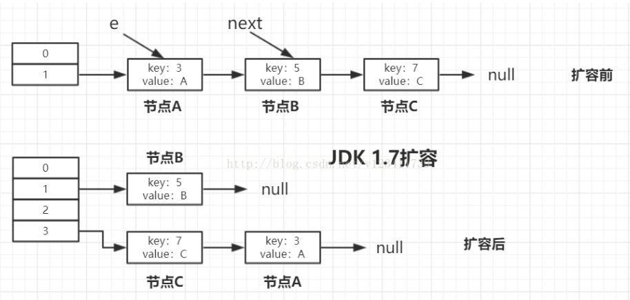 我们知道,JDK 1.8 以前,导致死循环的主要原因是扩容后,节点的顺序会反掉,如下图:扩容前节点 A 在节点 C 前面,而扩容后节点 C 在节点 A 前面。