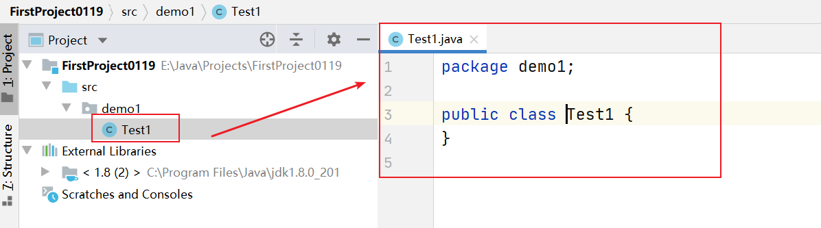 注意:这个是类的名字(文件名),首字母必须大写。这里就比如“Test1”。