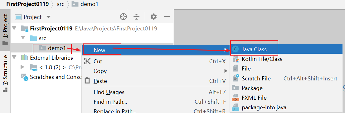 若我们想在demo1里面创建Java文件,在demo处右键“new”-->“Java class”