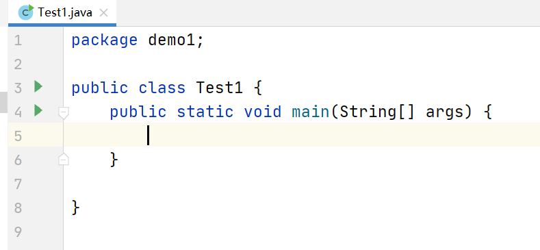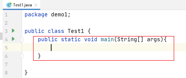 我们在刚才的Test1文件中写Java代码,先写上主方法: