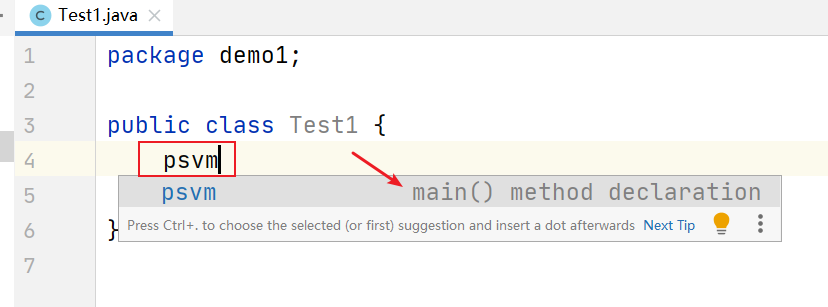 敲上“psvm”,如图所示的小框出现,然后回车。