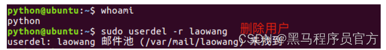 | -r 用户名 | 删除用户主目录,必须要设置,否则用户主目录不会删除 |