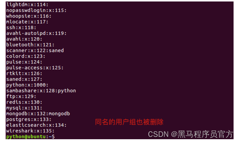 - 删除用户使用 sudo userdel -r 用户名,默认会删除同名的用户组。