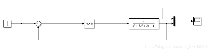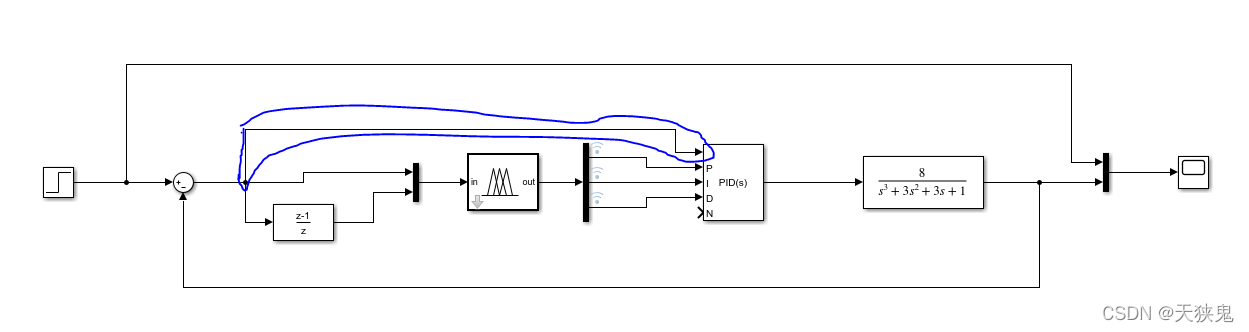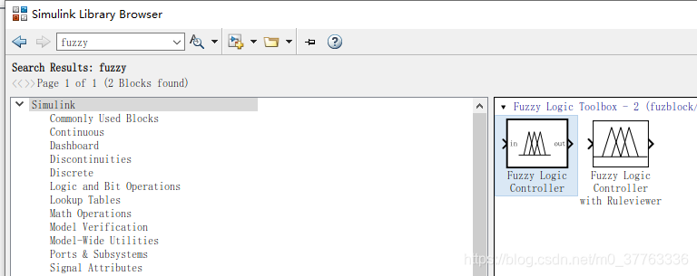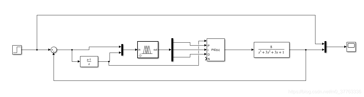 在库里面找到Fuzzy Logic Controlller模块,拖到Blank里面。相关的还需要step(阶跃信号),sum(输入输出反馈),PID(一个完整的控制算法块,也可以自己写),mux(用于整合图形),scope(显示结果)。