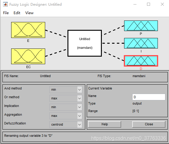 (3)Edit -> Add variables -> Input;Edit -> Add variables -> Output;Edit -> Add variables -> Output。单击选中,分别对 input1 、input2、output1、output2、output3 进行隶属度编辑。对于输入进行命名,分别为误差 E 和误差变化率 EC。输出分别命名为P、I、D,其他不变。