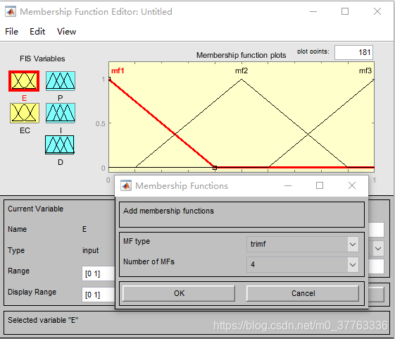 (4)双击 Input1 进入隶属度编辑器,Edit -> Add MFS 。添加隶属度函数,这里采用三角形隶属度函数,添加4个,实际应该对每一个都添加4个,并进行编辑。