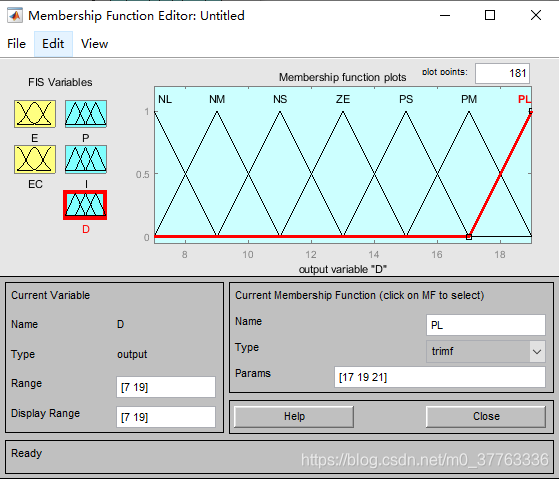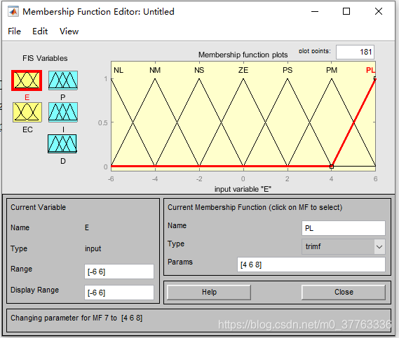 b. 还有就是隶属度函数命名的时候,最好是有顺序的,单击隶属度函数曲线,设计顺序:mf1->NL;mf2->NM;mf3->NS;mf4->ZE;mf5->PS;mf6->PM;mf7->PL。这样设置的好处是后面添加模糊规则的时候很方便。