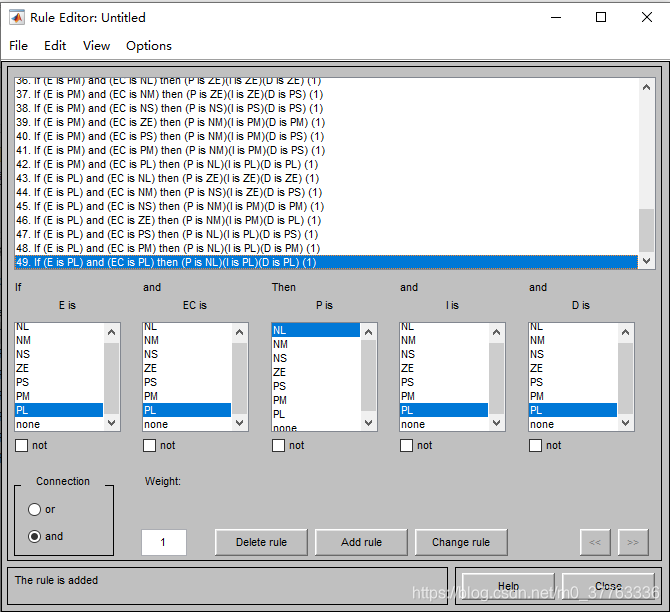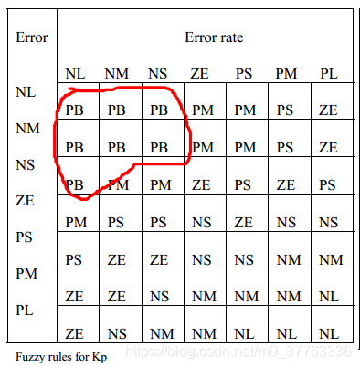 (7)设计模糊规则,这里的设计规则选取的是一篇文献中的规则表,我主要是考虑方便,实际上,这种模糊规则表是决定模糊PID效果的关键之一(还有就是隶属度函数的确定)。如果这里设计的不好,最后出来的PID阶跃响应可能还不如手工调整PID,虽然这种方式对于在线调整是不太可能实现的。调整规则如下,参考文献 [2]。