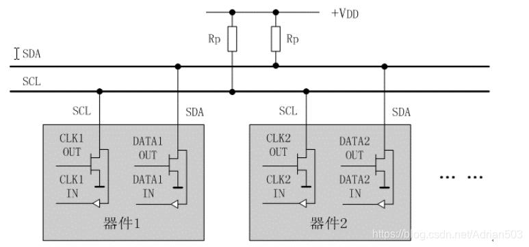 (1) 上拉电阻一般在4.7k~10k之间 ,当总线空闲时,两根线都是 High ,连到总线上的任一设备输出低电平,都将使总线信号变低,即各器件的SDA SCL 是“与”的关系。