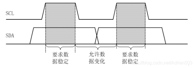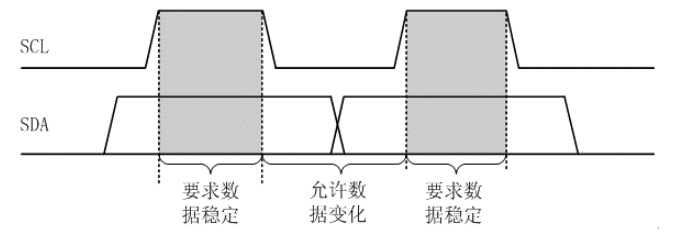 I2C 总线在数据传输的时候,时钟信号SCL 为高电平期间,数据线SDA上的数据必须保持稳定,只有在是时钟线上的信号为低电平期间,数据线上的电平才允许变化。