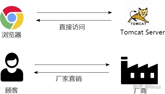 在直接访问的情形中, 浏览器直接访问了最终生成响应的服务器, 类似我们以厂家直销的方式从厂商购物, 如下图所示: