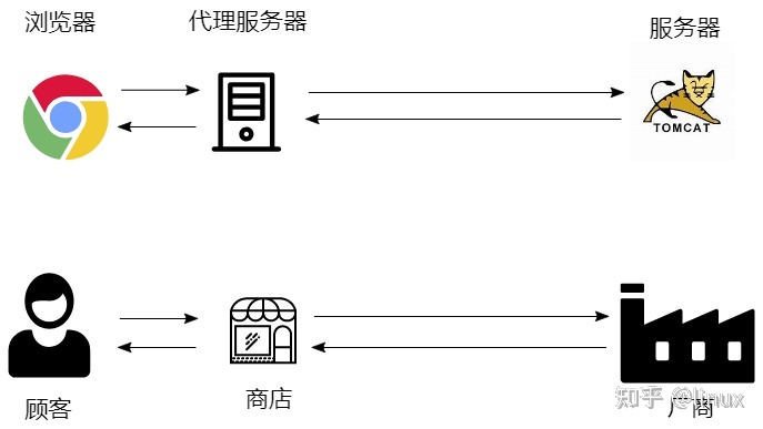 在(正向)代理的情形中, 浏览器主动访问代理服务器, 通过它间接获取最终响应, 类似我们从商店购物, 而商店的物品又是从厂家购来的, 如下图所示: