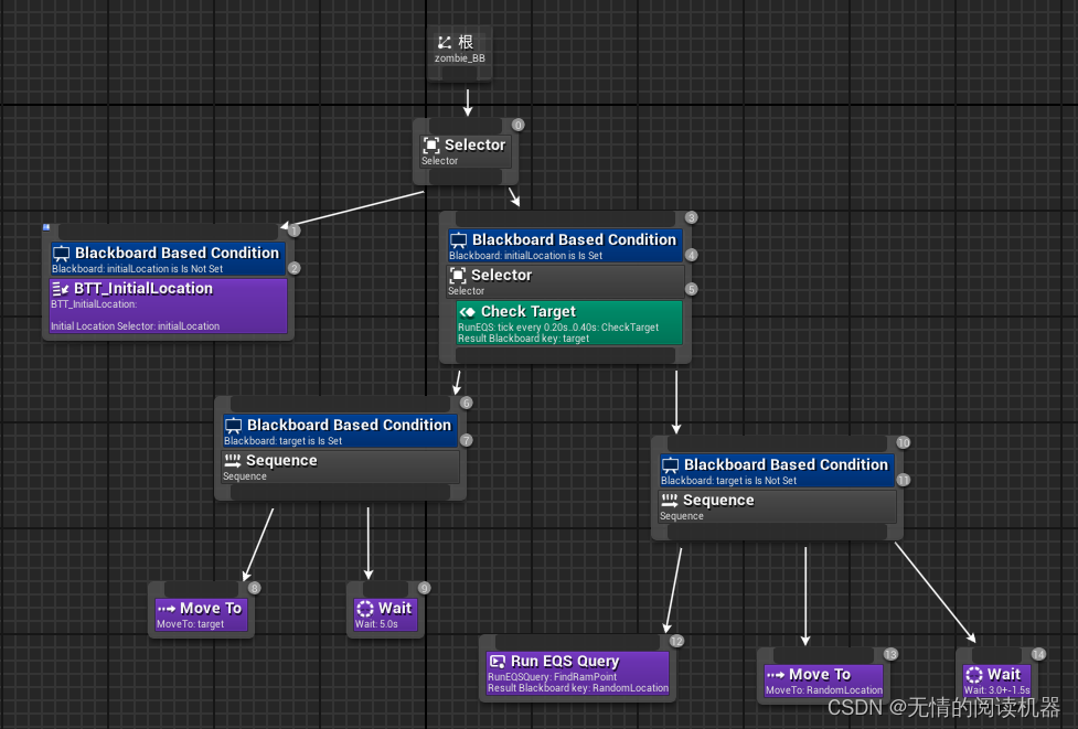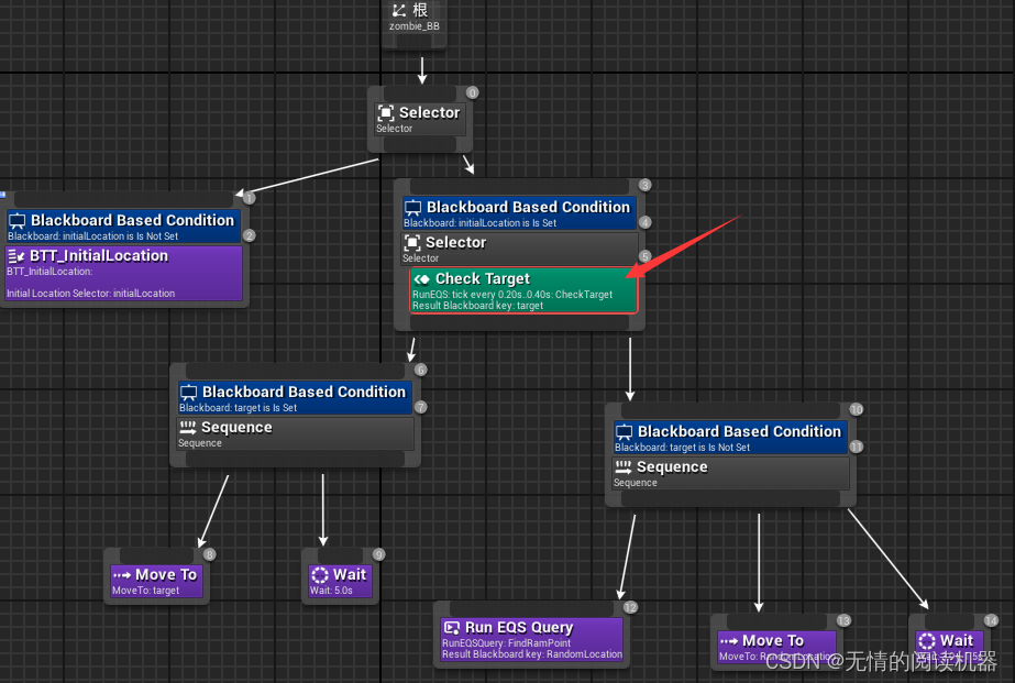 现在测试一下:发现了一个bug,当僵尸发现主角之后,就一直追着主角,因为黑板中的target一直都是主角。这是因为即使看不到主角,也不会将taget置为空值。