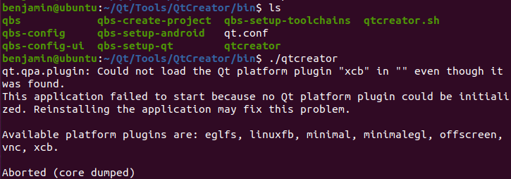 qt.qpa.plugin: Could not load the Qt platform plugin "xcb" in "" even though it was found. This application failed to start because no Qt platform plugin could be initialized. Reinstalling the application may fix this problem. Available platform plugins are: eglfs, linuxfb, minimal, minimalegl, offscreen, vnc, xcb. Aborted (core dumped)解决办法: