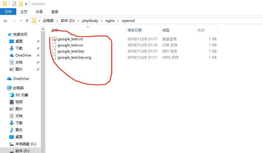 至此,证书生成完毕。我们发现,openssl文件夹中一共生成了4个文件。下面,配置https服务器的时候,我们需要用到的是其中的google_test.crt和google_test.key这两个文件。