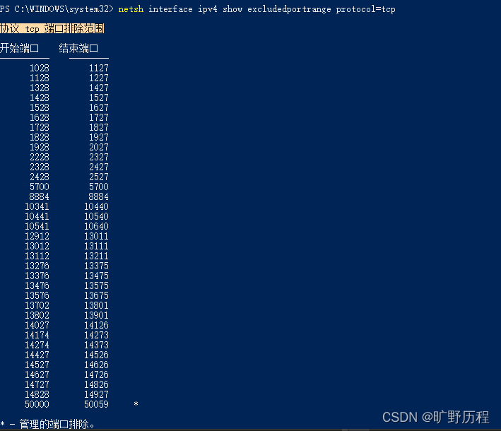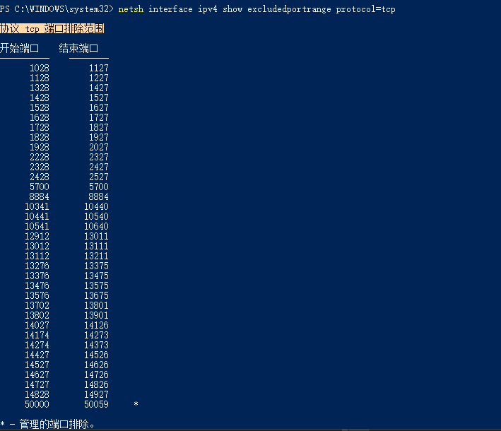 于是开始再分析端口是否被排除或端口是否被保留的问题,后来发现端口被保留了。