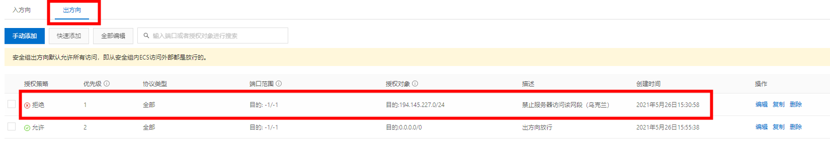 近日,公司服务器被挖矿程序袭击,经查该IP地址是乌克兰的,在阿里云安全组策略上设置,禁止该IP地址段访问我们和阿里云去访问该乌克兰地址。