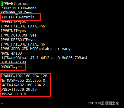 c)vi /etc/sysconfig/network-scripts/ifcfg-ens33 编辑静态ip