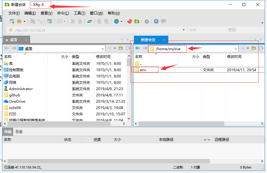 2.用Xftp 6连接到服务器,新建文件夹 /home/myVue/env