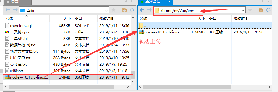 3.打开/home/myVue/env文件夹,将下载的node-v10.15.3-linux-x64.tar上传到云服务器