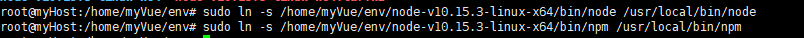 sudo ln -s /home/myVue/env/node-v10.15.3-linux-x64/bin/npm /usr/local/bin/npm