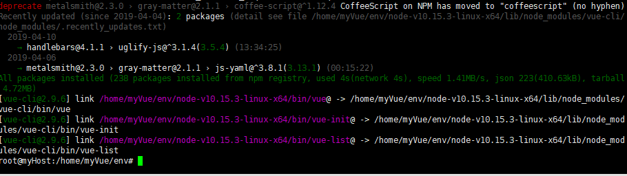 sudo ln -s /home/myVue/env/node-v10.15.3-linux-x64/bin/vue /usr/bin/vue如果不想每次全局安装后都去建立软链接,可以在安装完npm或cnpm后,