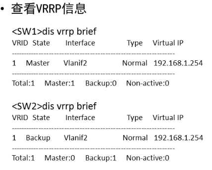 [sw2-Vlanif1]vrrp vrid 1 virtual-ip 192.168.1.254 //开启vlan1的vrrp