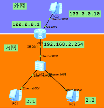 [Huawei-GigabitEthernet0/0/0]nat static global 100.0.0.2 inside 192.168.2.1 //使用静态nat技术,将内部的2.1与外部的公网地址100.0.0.2进行相互转换, 然后测试使用192.168.2.1 ping 100.0.0.10可以互通说明地址转换成功