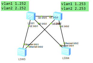 [sw1-port-group 1]port trunk allow-pass vlan all //放行所有vlan 的数据所有交换机均按照以上方法将所有接口配置为trunk,注意sw3与sw4是E口