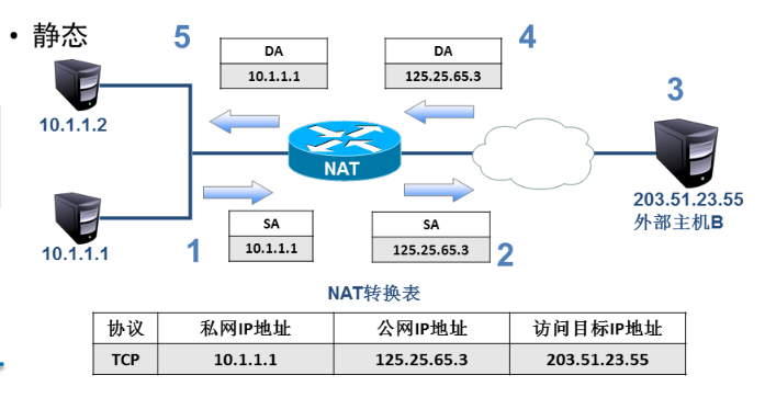 静态转换是指:将内部的私有地址转换为公有地址时,IP地址的对应关系是确定的(1对1)