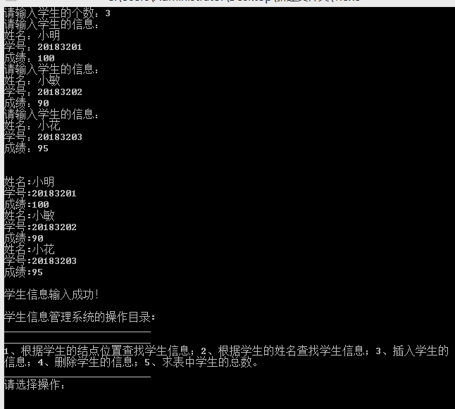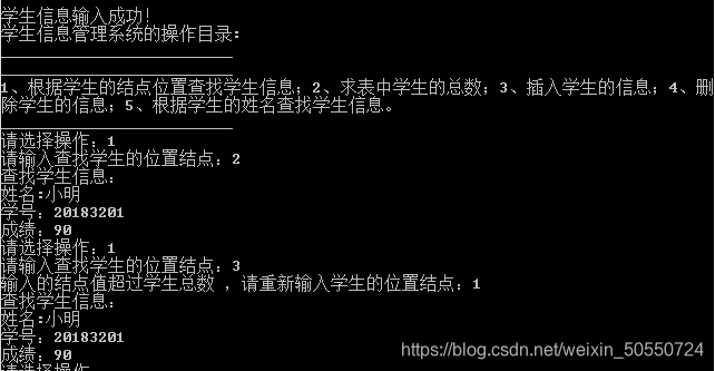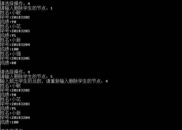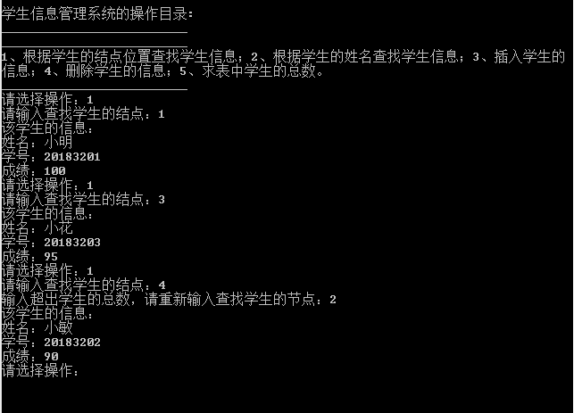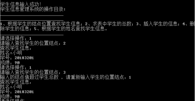 void putlist(Linklist L)//打印学生信息。 { Linklist p; p=L->next; while(p) { printf("姓名:%s\n学号:%s\n成绩:%d\n",p->data.name,p->data.no,p->data.price); p=p->next; printf(" "); }printf("\n"); } int lengthlist(Linklist L)//求学生的总数。 { Linklist p; int j; p=L->next; j=0; while(p!=NULL) { j++; p=p->next; } printf("表中的学生总数为:%d\n",j); } void namegetlist(Linklist L)//根据学生姓名查找学生的信息。 { char name[10]; int j=1; Linklist p; printf("请输入查找学生的姓名:"); scanf("%s",&name); p=L->next; while(p&&strcmp(p->data.name,name)!=0) { p=p->next; j++; } if(p) printf("该学生的信息:\n学号:%s\n成绩:%d\n",p->data.no,p->data.price); else printf("该表中没有该学生的信息。"); } void getlist(Linklist L)//根据学生结点位置查找学生信息。 { int i,j=1,l=0; Linklist p; printf("请输入查找学生的位置结点:"); scanf("%d",&i); p=L->next; while(p!=NULL) { l++; p=p->next; } p=L->next; while((p->next)&&(j<i)) { p=p->next; ++j; } while(i>l) { printf("输入的结点值超过学生总数 ,请重新输入学生的位置结点:"); scanf("%d",&i); } while((p!=NULL)&&(j<i)) { p=p->next; j++; } printf("查找学生信息:\n姓名:%s\n学号:%s\n成绩:%d\n",p->data.name,p->data.no,p->data.price); } void insertlist(Linklist L)//学生信息插入。 { int i,j,l; Linklist p,s; p=L;l=0; while(p!=NULL) { l++; p=p->next; } printf("请输入插入学生的结点位置:"); scanf("%d",&i); while(l<i) { printf("输入的结点值已超过总数,请重新输入插入学生的结点位置:"); scanf("%d",&i); } p=L;j=1; while(p&&(j<i)) { p=p->next; ++j; } s=(Linklist)malloc(sizeof(LNode)); printf("请输入学生的信息:\n"); printf("姓名:"); scanf("%s",&s->data.name); printf("学号:"); scanf("%s",&s->data.no); printf("成绩:"); scanf("%d",&s->data.price); s->next=p->next; p->next=s; printf("学生信息插入成功!"); printf("\n"); } void deletelist(Linklist L)//学生信息的删除。 { int i,j,l=0; Linklist p,q; p=L->next; while(p!=NULL) { l++;p=p->next; } printf("请输入要删除学生的位置结点:"); scanf("%d",&i); while(l<i) { printf("输入的结点值超过总数,请重新输入要删除学生的位置结点:"); scanf("%d",&i); } p=L; j=1; while((p->next)&&(j<i)) { p=p->next; ++j; } q=p->next; p->next=q->next; free(q); printf("删除成功!\n"); } int main()//主函数 { Linklist L; int k; L=creatlist(); printf("\n"); putlist(L); printf("学生信息输入成功!\n"); printf("学生信息管理系统的操作目录:\n"); printf("__________________________\n"); printf("__________________________\n"); printf("1、根据学生的结点位置查找学生信息;2、求表中学生的总数;3、插入学生的信息;4、删除学生的信息;5、根据学生的姓名查找学生信息。\n"); printf("__________________________\n"); while(1) { printf("请选择操作:"); scanf("%d",&k); switch(k) { case 0:printf("谢谢使用!");exit(0); case 1:getlist(L);break; case 2:lengthlist(L);break; case 3:insertlist(L);putlist(L);break; case 4:deletelist(L);putlist(L);break; case 5:namegetlist(L);break; } } }
