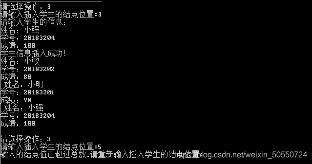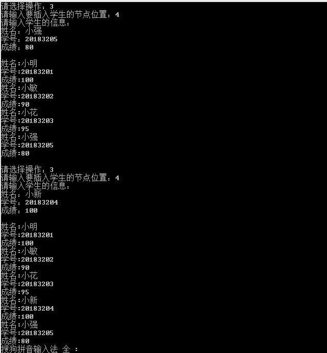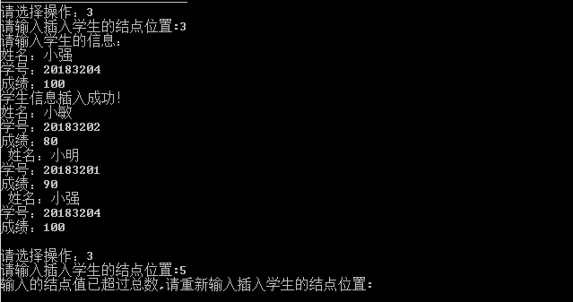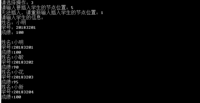 (5) 给定一个学生信息,插入到表中指定的位置; 运行结果: