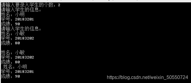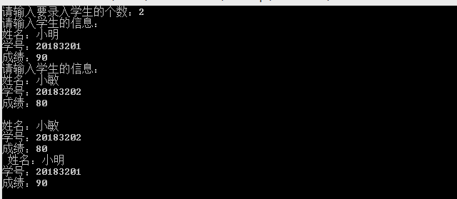 三、全部代码单链表:#include<stdio.h> #include<stdlib.h> #include<string.h> #include<malloc.h> typedef struct { char no[10]; //8位学号 char name[20]; //姓名 int price; //成绩 }Student; typedef struct LNode { Student data; struct LNode *next; }LNode,*Linklist; Linklist creatlist()//(头插入法)输入学生信息。 { Linklist L,p; int i,n; L=(Linklist)malloc(sizeof(LNode)); L->next=NULL; printf("请输入要录入学生的个数:"); scanf("%d",&n); for(i=0;i<n;i++) { p=(Linklist)malloc(sizeof(LNode)); printf("请输入学生的信息:\n"); printf("姓名:"); scanf("%s",&p->data.name); printf("学号:"); scanf("%s",&p->data.no); printf("成绩:"); scanf("%d",&p->data.price); p->next=L->next; L->next=p; } return L; }