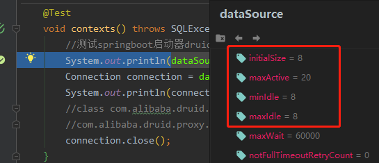 2、输入结果拿到的是阿里巴巴druid数据库自动配置starater的连接池和连接