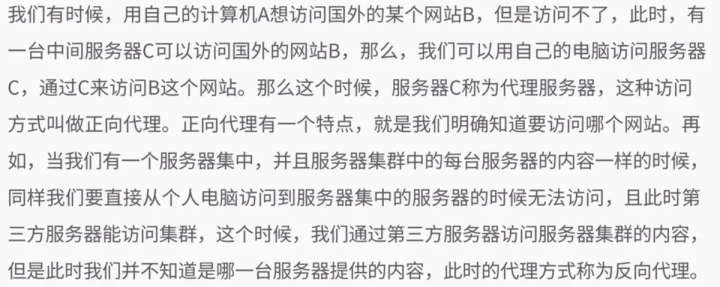 就是用自己的计算机 A 想访问国外的网站 B ,访问不了,就有一个中间的服务器 C 它去访问国外的网站 B ,其实如果是把这个 C 装到我们自己的电脑上,我们自己的电脑访问 C ,然后 C 再去访问 B ,这个时候这个 C 就叫代理服务器,这个时候就是正向代理,他有一个特点,就是我们一定知道要访问哪个网站