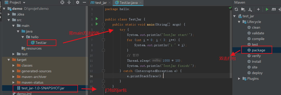 </project>注意:在pom.xml里面通过<mainClass>hello.TestJar</mainClass>指定了主类,如果不指定,可能会出现“xxx.jar中没有主清单属性”的问题。