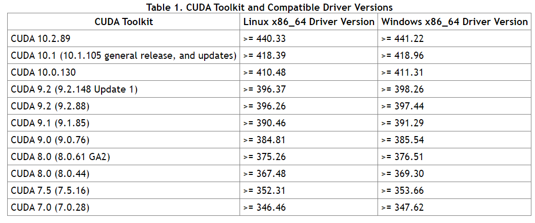根据自己的需要选择合适的驱动版本:https://docs.nvidia.com/cuda/cuda-toolkit-release-notes/index.html