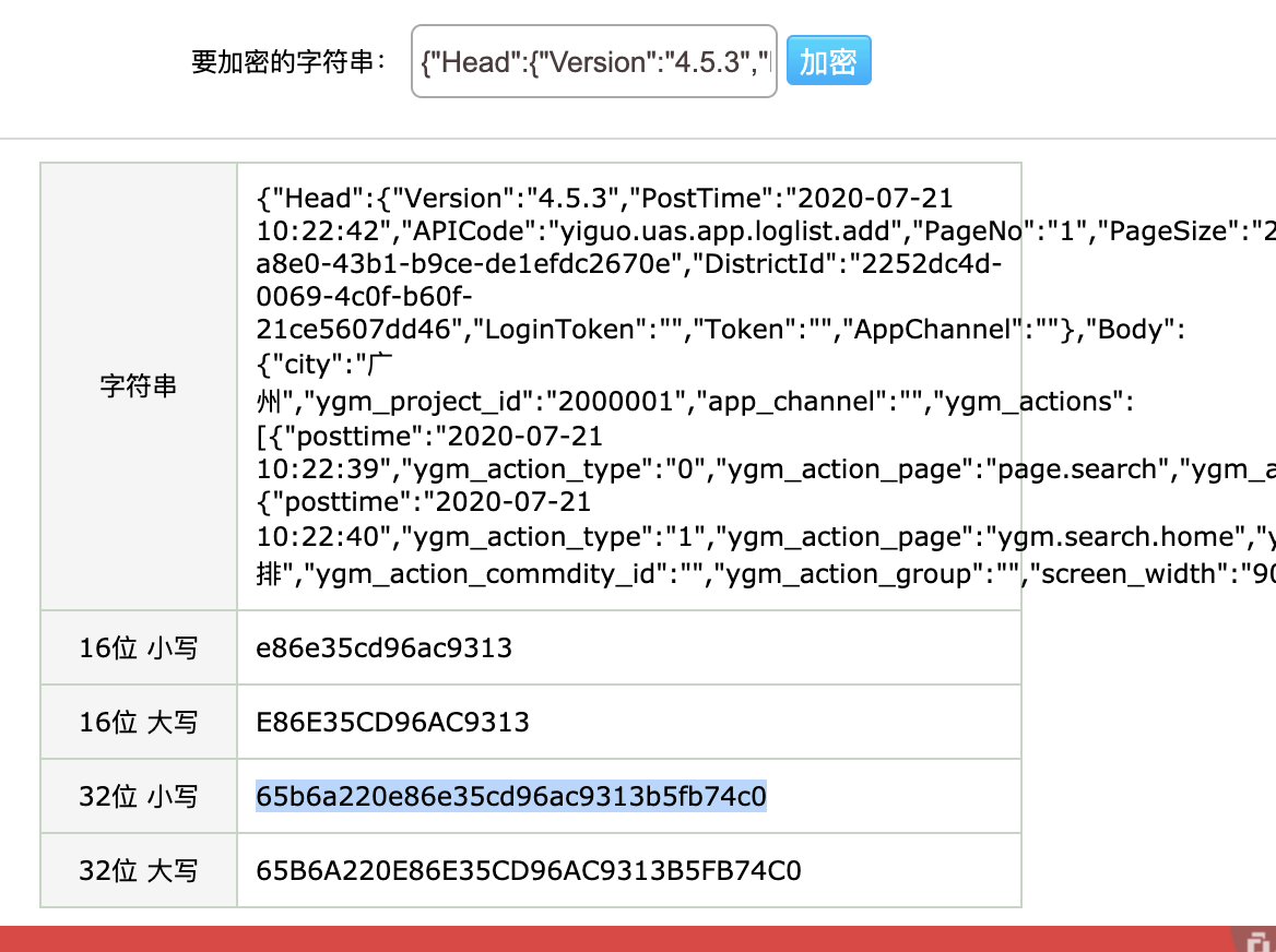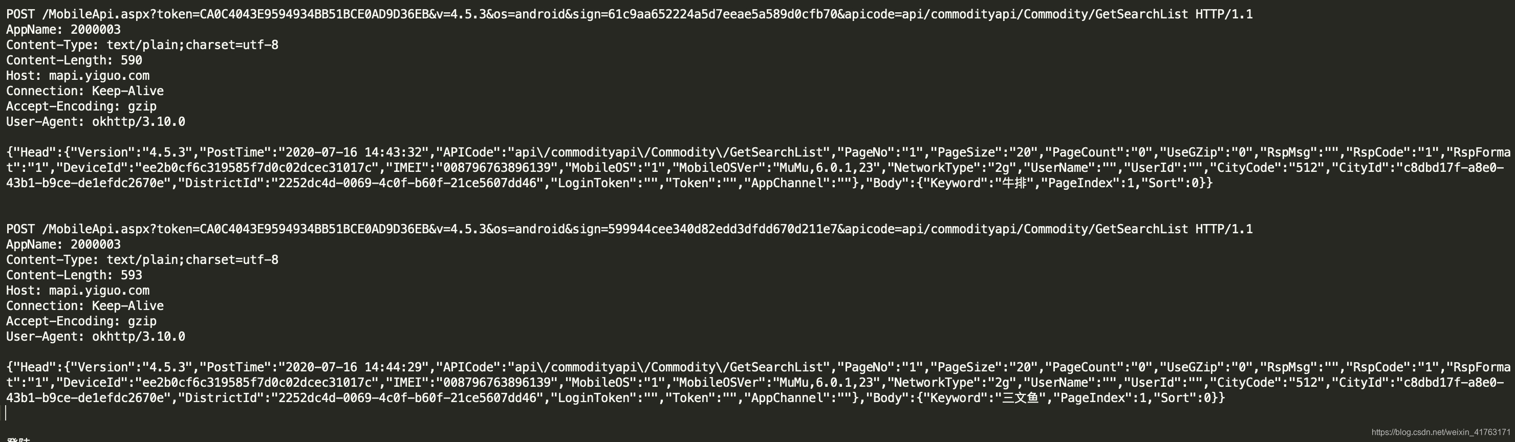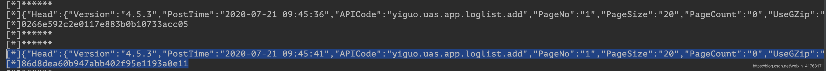 第一串:{"Head":{"Version":"4.5.3","PostTime":"2020-07-21 10:22:42","APICode":"yiguo.uas.app.loglist.add","PageNo":"1","PageSize":"20","PageCount":"0","UseGZip":"1","RspMsg":"","RspCode":"1","RspFormat":"1","DeviceId":"ee2b0cf6c319585f7d0c02dcec31017c","IMEI":"008796763896139","MobileOS":"1","MobileOSVer":"MuMu,6.0.1,23","NetworkType":"2g","UserName":"","UserId":"","CityCode":"512","CityId":"c8dbd17f-a8e0-43b1-b9ce-de1efdc2670e","DistrictId":"2252dc4d-0069-4c0f-b60f-21ce5607dd46","LoginToken":"","Token":"","AppChannel":""},"Body":{"city":"广州","ygm_project_id":"2000001","app_channel":"","ygm_actions":[{"posttime":"2020-07-21 10:22:39","ygm_action_type":"0","ygm_action_page":"page.search","ygm_action_code":"ygm.search.view","ygm_action_referrer":"page.category.result","ygm_action_referrer_tag":"","ygm_action_tag":"","ygm_action_commdity_id":"","ygm_action_group":"","screen_width":"900","screen_height":"1440","ygm_action_component_id":"","ygm_action_coupon_code":"","ygm_action_category_id":"","ygm_action_tab_id":"","ygm_action_url":"","ygm_activity_id":"","ygm_action_ad_id":"","ygm_action_promotioninfo_id":"","ygm_action_category_highid":"","ygm_page_id":"","referrer":"","ext_1":"","ext_2":"","ext_3":"","ext_4":"","ext_5":"","ext_6":"","ext_7":"","ext_8":"","keyword":""},{"posttime":"2020-07-21 10:22:40","ygm_action_type":"1","ygm_action_page":"ygm.search.home","ygm_action_code":"ygm.search.home.history.click","ygm_action_referrer":"","ygm_action_referrer_tag":"","ygm_action_tag":"牛排","ygm_action_commdity_id":"","ygm_action_group":"","screen_width":"900","screen_height":"1440","ygm_action_component_id":"","ygm_action_coupon_code":"","ygm_action_category_id":"","ygm_action_tab_id":"","ygm_action_url":"","ygm_activity_id":"","ygm_action_ad_id":"","ygm_action_promotioninfo_id":"","ygm_action_category_highid":"","ygm_page_id":"","referrer":"","ext_1":"","ext_2":"","ext_3":"","ext_4":"","ext_5":"","ext_6":"","ext_7":"","ext_8":"","keyword":""}]}}
