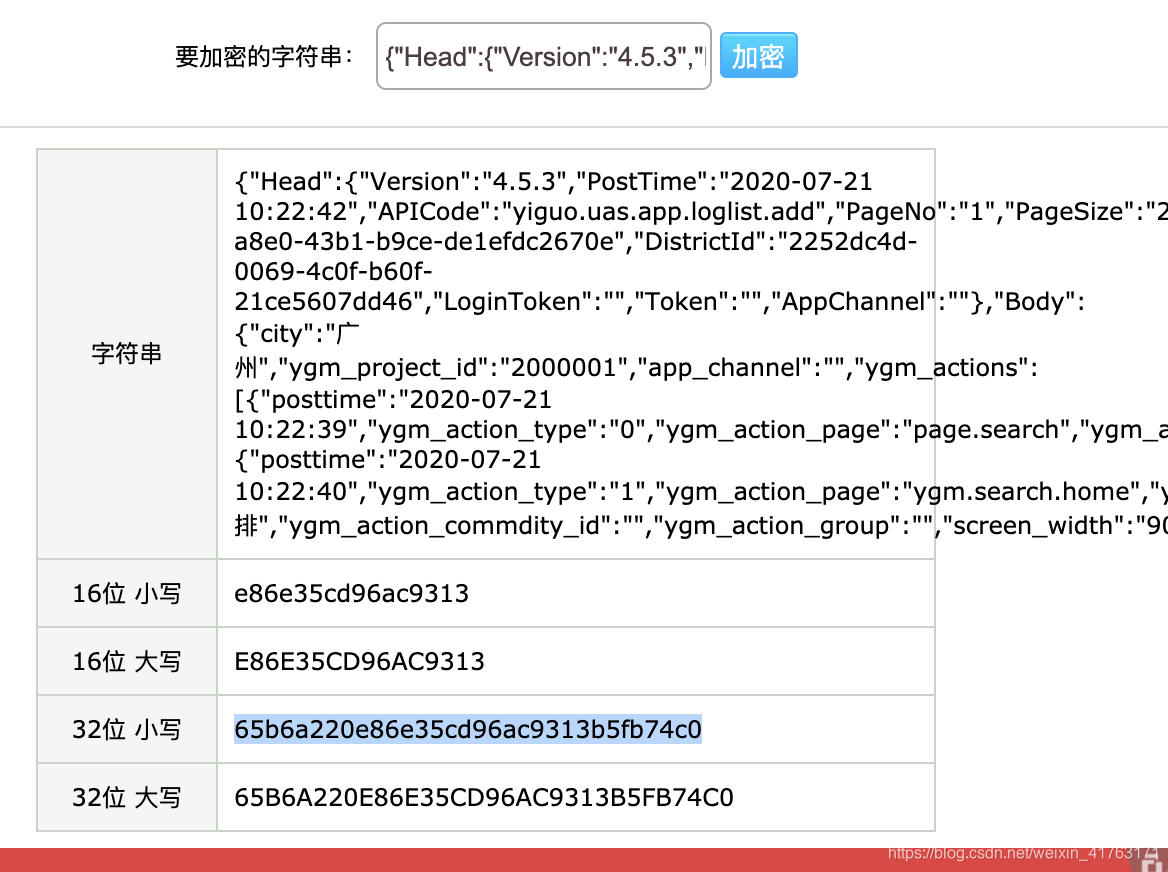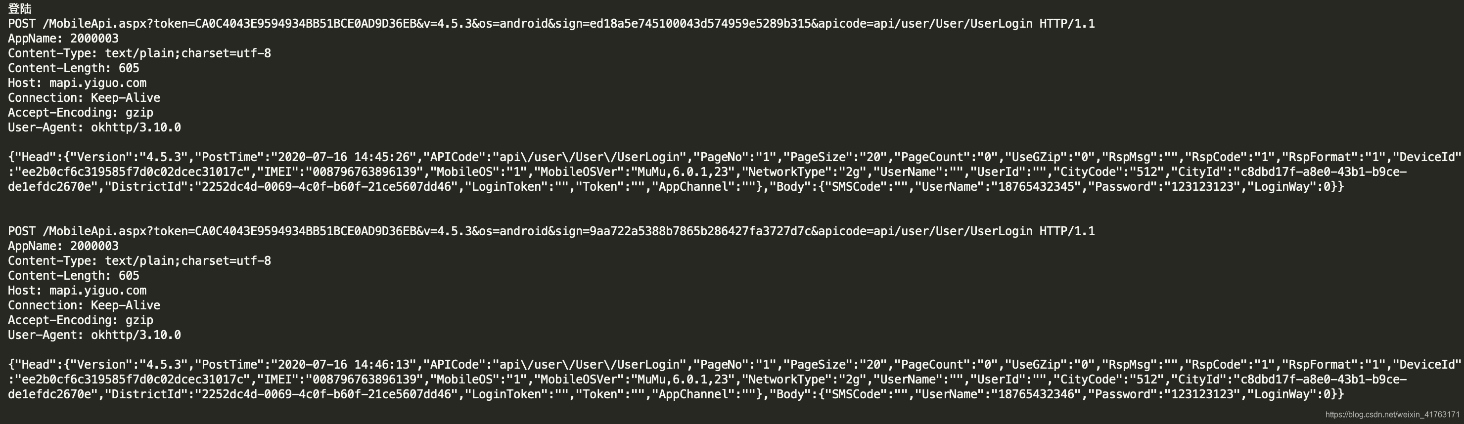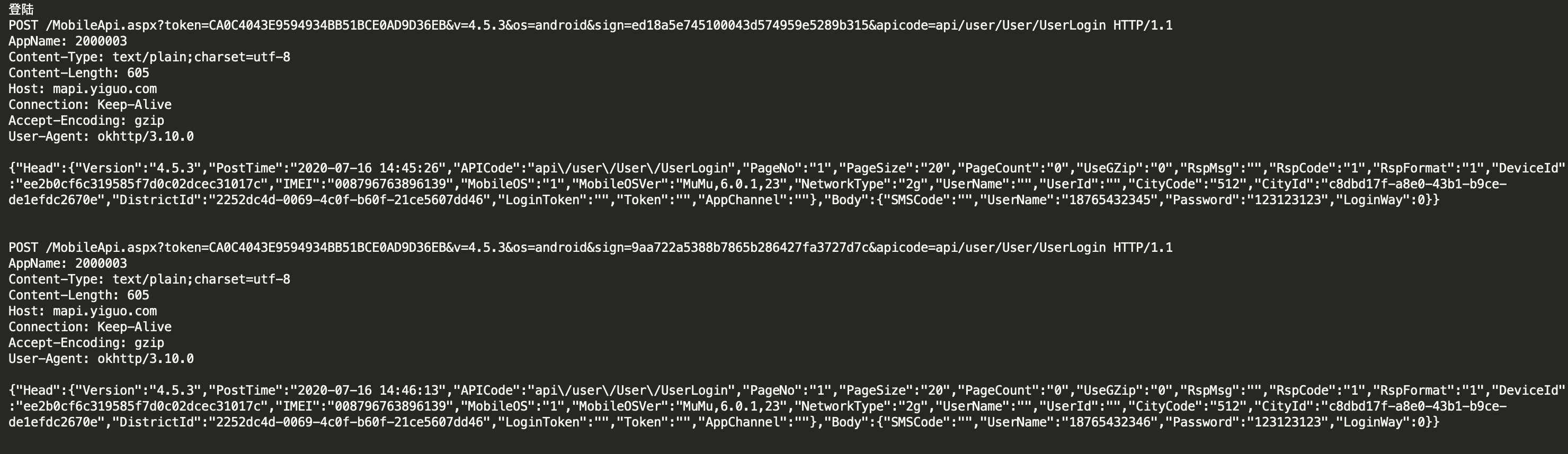 第一串:{"Head":{"Version":"4.5.3","PostTime":"2020-07-21 10:22:42","APICode":"yiguo.uas.app.loglist.add","PageNo":"1","PageSize":"20","PageCount":"0","UseGZip":"1","RspMsg":"","RspCode":"1","RspFormat":"1","DeviceId":"ee2b0cf6c319585f7d0c02dcec31017c","IMEI":"008796763896139","MobileOS":"1","MobileOSVer":"MuMu,6.0.1,23","NetworkType":"2g","UserName":"","UserId":"","CityCode":"512","CityId":"c8dbd17f-a8e0-43b1-b9ce-de1efdc2670e","DistrictId":"2252dc4d-0069-4c0f-b60f-21ce5607dd46","LoginToken":"","Token":"","AppChannel":""},"Body":{"city":"广州","ygm_project_id":"2000001","app_channel":"","ygm_actions":[{"posttime":"2020-07-21 10:22:39","ygm_action_type":"0","ygm_action_page":"page.search","ygm_action_code":"ygm.search.view","ygm_action_referrer":"page.category.result","ygm_action_referrer_tag":"","ygm_action_tag":"","ygm_action_commdity_id":"","ygm_action_group":"","screen_width":"900","screen_height":"1440","ygm_action_component_id":"","ygm_action_coupon_code":"","ygm_action_category_id":"","ygm_action_tab_id":"","ygm_action_url":"","ygm_activity_id":"","ygm_action_ad_id":"","ygm_action_promotioninfo_id":"","ygm_action_category_highid":"","ygm_page_id":"","referrer":"","ext_1":"","ext_2":"","ext_3":"","ext_4":"","ext_5":"","ext_6":"","ext_7":"","ext_8":"","keyword":""},{"posttime":"2020-07-21 10:22:40","ygm_action_type":"1","ygm_action_page":"ygm.search.home","ygm_action_code":"ygm.search.home.history.click","ygm_action_referrer":"","ygm_action_referrer_tag":"","ygm_action_tag":"牛排","ygm_action_commdity_id":"","ygm_action_group":"","screen_width":"900","screen_height":"1440","ygm_action_component_id":"","ygm_action_coupon_code":"","ygm_action_category_id":"","ygm_action_tab_id":"","ygm_action_url":"","ygm_activity_id":"","ygm_action_ad_id":"","ygm_action_promotioninfo_id":"","ygm_action_category_highid":"","ygm_page_id":"","referrer":"","ext_1":"","ext_2":"","ext_3":"","ext_4":"","ext_5":"","ext_6":"","ext_7":"","ext_8":"","keyword":""}]}}