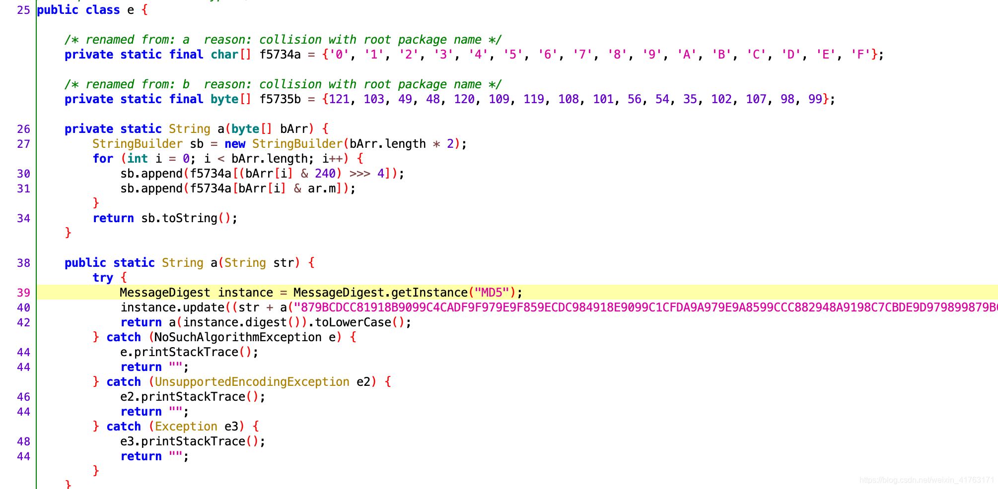 上面的是调用部分,我们继续分析一下,前面是固定的url前半部分,后面是sign的值以及后面的参数,这个时候我们就可以跟进这个e.a(str)方法了,继续找,跳到声明: