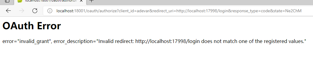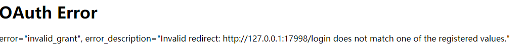 error="invalid_grant", error_description="Invalid redirect: http://localhost:17998/login does not match one of the registered values."