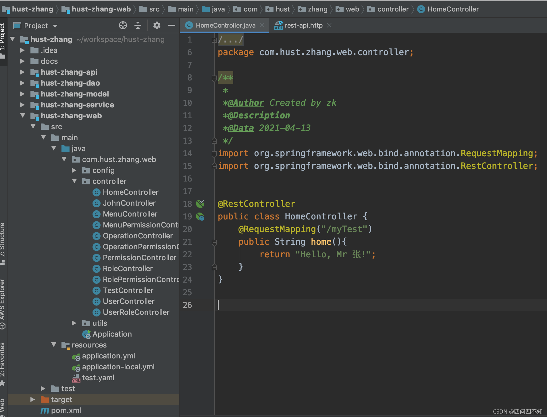1、HTTP Client是IDEA默认安装的插件,之前写过的工程,访问控制层的一个简单接口如下,