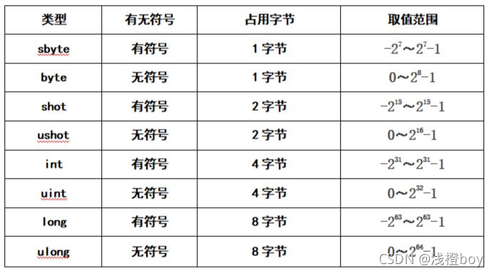 整形就是用来存储整数,按照取值范围将整形又分成了几个类型,分别是byte类型,shot类型,int类型,long类型,且还分别定义了有符号和无符号。有符号代表可以定义0以下的值也就是负数而无符号只能定义0以上和0的值,具体的取值范围如下图。